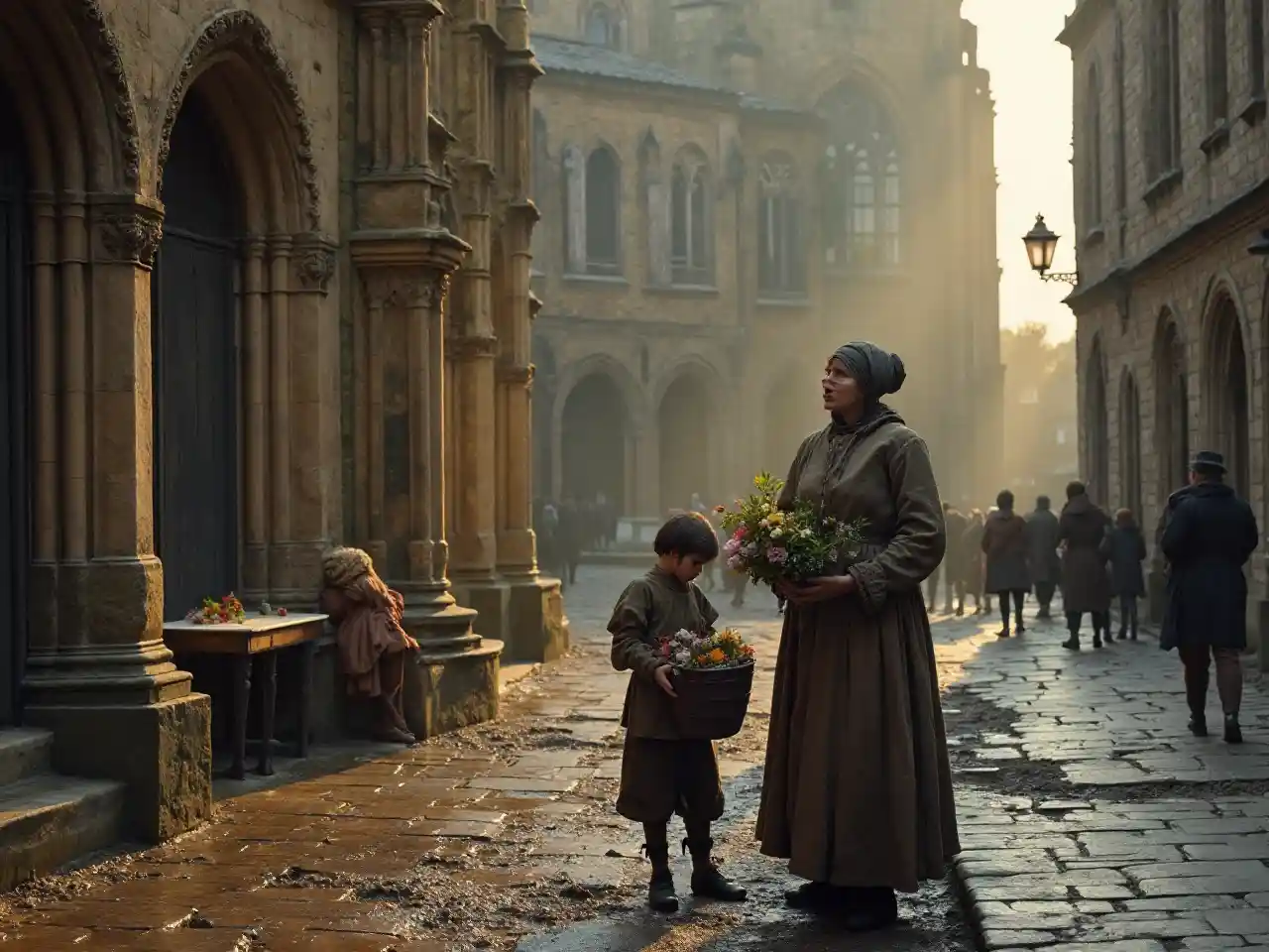 Một phụ nữ bán hoa Gypsy thế kỷ 14 đứng cạnh bức tường bên của một nhà thờ Gothic tráng lệ. Phía sau cô, những bức tường đá cao chót vót của nhà thờ cho thấy những vòm tường phức tạp và những cửa sổ vòm Gothic khổng lồ. Bên cạnh cô, một nghệ sĩ biểu diễn đường phố ăn mặc rách rưới đang tung hứng một cách khéo léo. Đất lầy lội, một vũng nước, người đi bộ. Chi tiết lịch sử phong phú. Hoàng hôn. Sương mù