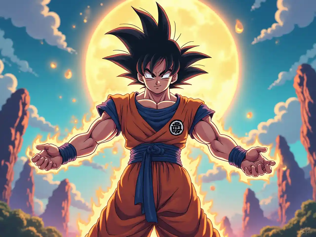 Cảnh năng động của nhân vật anime mang tính biểu tượng Son Goku trong bộ giáp Saiyan mang tính biểu tượng. Anh ta đứng sừng sững, thân hình vạm vỡ và mái tóc đen sắc nét, toát lên một bầu không khí mạnh mẽ và tự tin. Bối cảnh là một cảnh quan phi thường sống động, đầy những hòn đảo nổi và trăng tròn rực rỡ. Mắt Goku nhắm lại và cơ thể cậu đang phát sáng khi cậu dẫn một nguồn năng lượng khổng lồ vào vầng hào quang vàng khổng lồ bao quanh cậu. Hắn mở rộng hai tay, như thể đang chuẩn bị cho một cuộc tấn công hủy diệt. Phong cách nghệ thuật nắm bắt mọi chi tiết của hình dạng của anh ta, từ kết cấu phức tạp của áo giáp của anh ta đến các sợi tóc riêng lẻ của mái tóc của anh ta. Bảng màu đậm và tươi sáng, với các tông màu vàng, xanh và tím chiếm ưu thế. Hình ảnh là minh chứng cho sức mạnh của Goku, cũng như tính nghệ thuật ngoạn mục của thế giới anime. Chi tiết mắt 2D