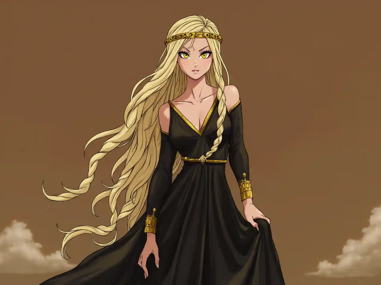 LeilaNgười phụ nữ tóc vàng có bím tóc dài, vương miện vàng mỏng, vòng tay vàng, mặc váy dài chữ V màu đen, váy dài, trên váy có chi tiết màu vàng, đôi mắt màu vàng tươi, nền là bầu trời màu nâu
