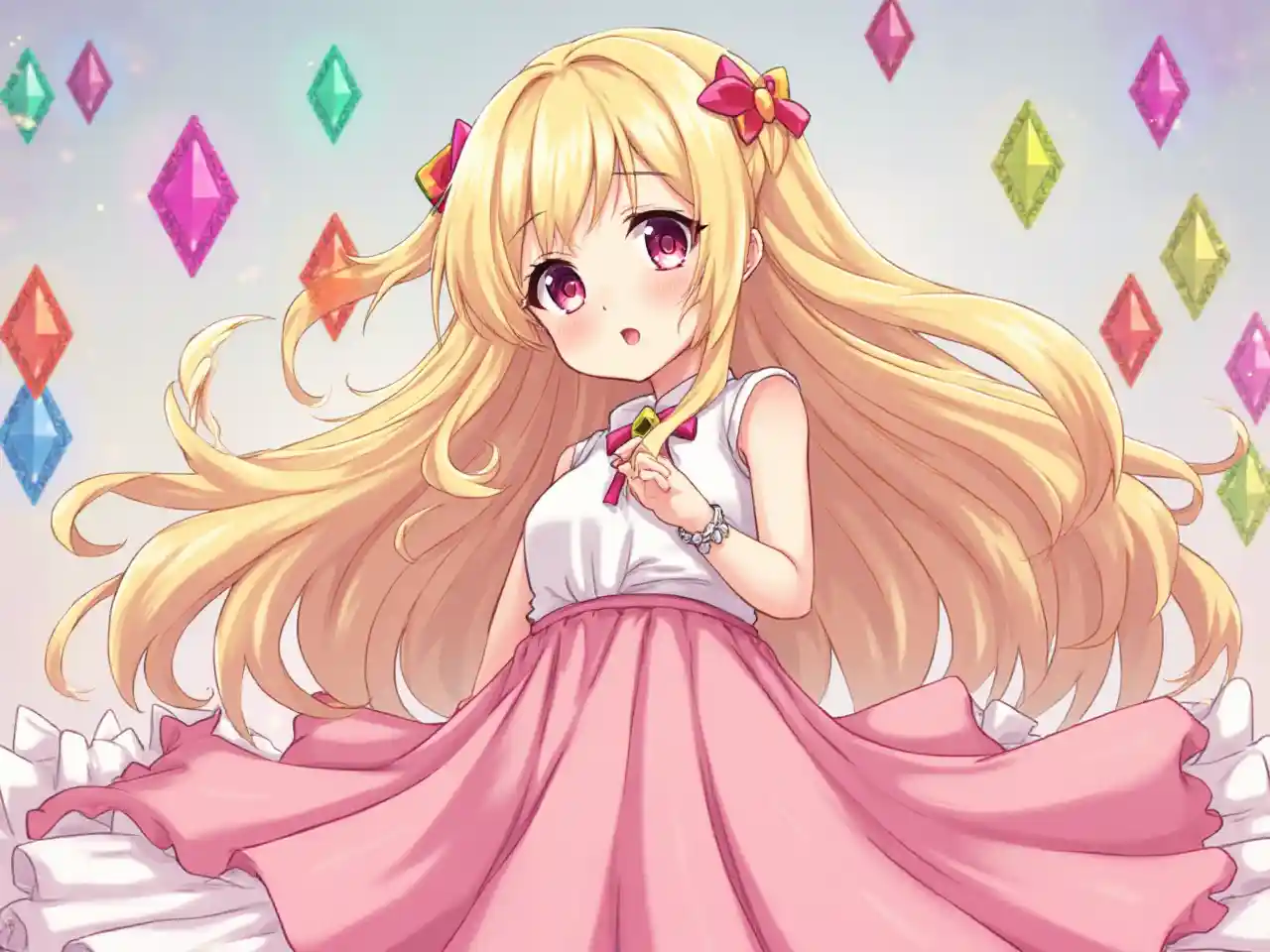 Màu vàng tóc dài màu hồng váy dài với kim cương màu ảnh anime và đôi mắt màu hồng đẹp