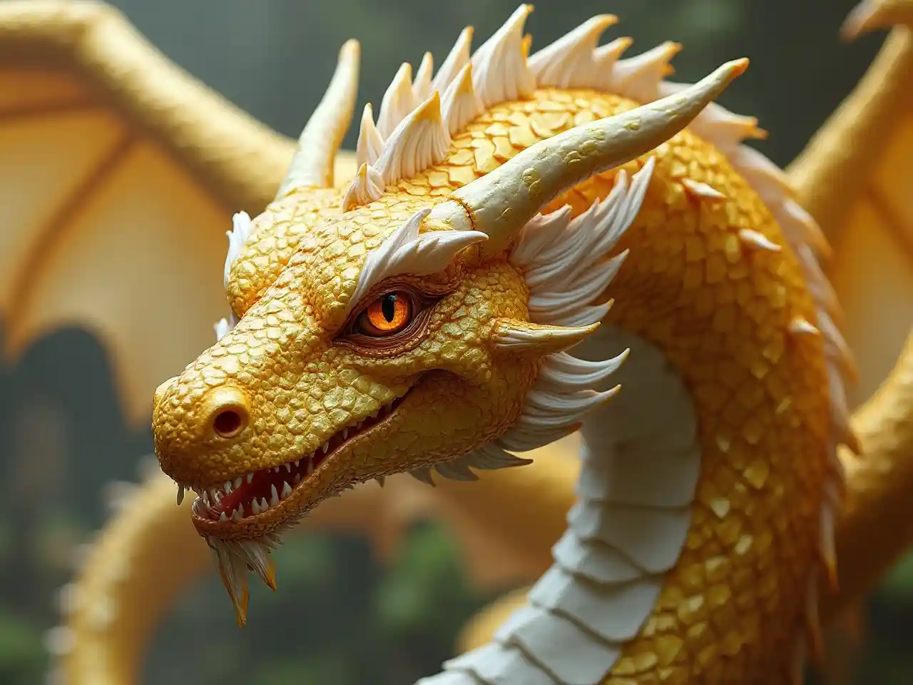 Con rồng vàng hung dữ có vảy cánh màu trắng và đôi mắt vàng có mũi