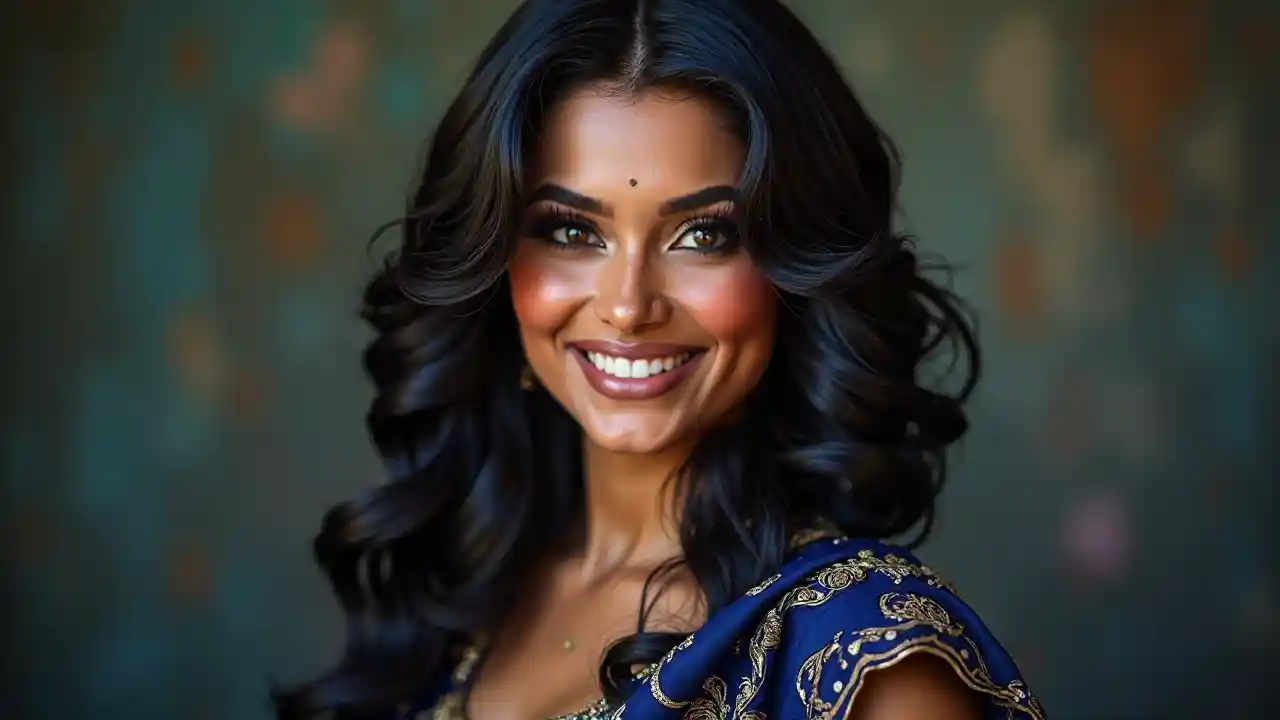 Một vận động viên thể hình nữ hoàng người Anh 25 tuổi, người Ấn Độ, có thân hình to lớn và vẻ ngoài tự tin đáng kinh ngạc. Cô ấy có một nụ cười rạng rỡ trên khuôn mặt, toát lên sự quyến rũ và tích cực. Trang phục của cô là một bộ trang phục truyền thống màu xanh sống động với các chi tiết phong phú đi kèm với thêu và tô điểm phức tạp. Mái tóc dài đen nhánh như tơ rủ xuống sau lưng cô, phác họa khuôn mặt xinh đẹp của cô. Đôi mắt to biểu cảm của cô, được tô điểm bằng cách trang điểm tinh tế, thu hút sự chú ý với chiều sâu mê hoặc. Nét nam tính sắc sảo, rõ ràng của cô được chiếu sáng bởi ánh sáng dịu dàng, dễ chịu, thể hiện rõ ràng từng chi tiết. Vóc dáng săn chắc, thanh lịch của cô giống như một nữ thần, thể hiện cả sức mạnh và sự duyên dáng. Phông nền được làm mờ nhẹ nhàng để nhấn mạnh sự hiện diện của cô và tạo ra một điểm nhấn hấp dẫn cho vẻ đẹp và khí chất của cô