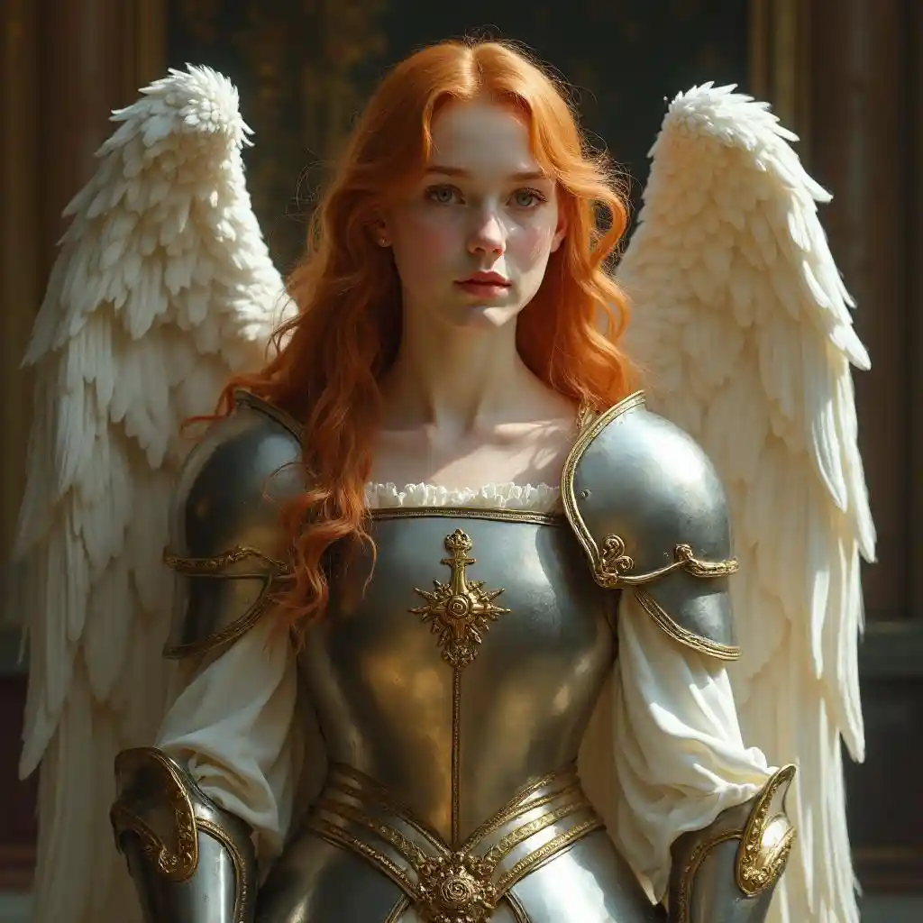 Thiên thần nữ thanh tao và xinh đẹp, với đôi cánh thanh tao khổng lồ, mặc áo giáp toàn bảng bằng vàng bạc, trong một nhà thờ, chân dung bán thân, vẻ mặt sùng đạo, ngây thơ, thực tế, mô hình Công giáo, lãng mạn, nghệ thuật khai sáng, khai sáng, cô gái thánh thiện, làn da nhợt nhạt, làn da trắng, mái tóc dài màu đỏ, phát sáng, vẽ bởi John Singer Sargent, Rembrandt chiếu sáng