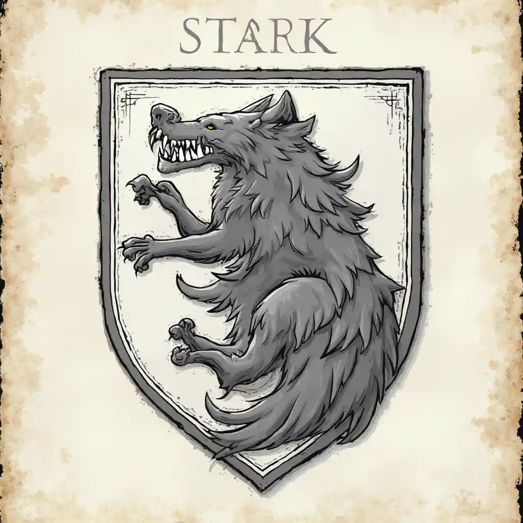 Một minh họa kỹ thuật số chi tiết cao về dấu ấn của gia đình Stark trong Game of Thrones. SIGIL được đặc trưng bởi những con sói băng xám trên cánh đồng màu trắng, được thiết kế theo phong cách huy hiệu thời trung cổ. Sói tuyết hung ác uy nghiêm, bộ lông chi tiết phức tạp, ánh mắt sắc bén. Nền có kết cấu và hiệu ứng giấy da lâu năm mang lại cảm giác lịch sử thực sự. Dấu ấn đậm nét và nổi bật, đại diện cho sức mạnh và danh dự của gia tộc Stark. Không có văn bản trong hình ảnh.