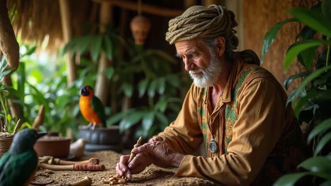 Thợ thủ công già khắc sáo trong túp lều trong rừng