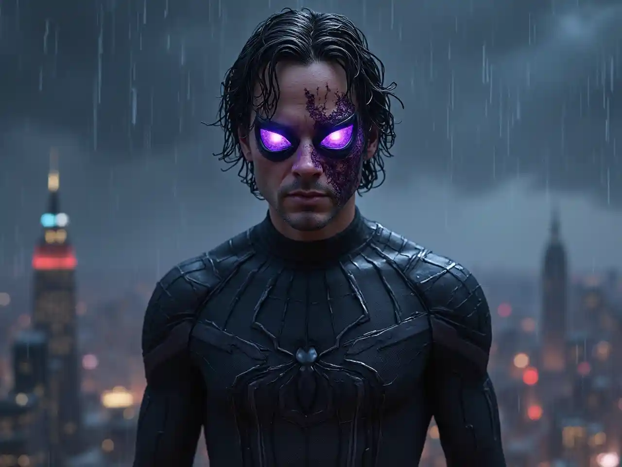 Keanu Reeves mặc bộ đồ Spider-Man màu đen và không đeo mặt nạ. Bầu trời rải rác các ngôi sao, và các lỗ đen đang tiêu thụ chúng. Trên mặt hắn có một vết thương, ánh sáng màu tím. Một khung cảnh thành phố đổ nát sau lưng anh. Trời mưa, tóc anh ướt sũng và có những vết nứt trong bộ đồ.