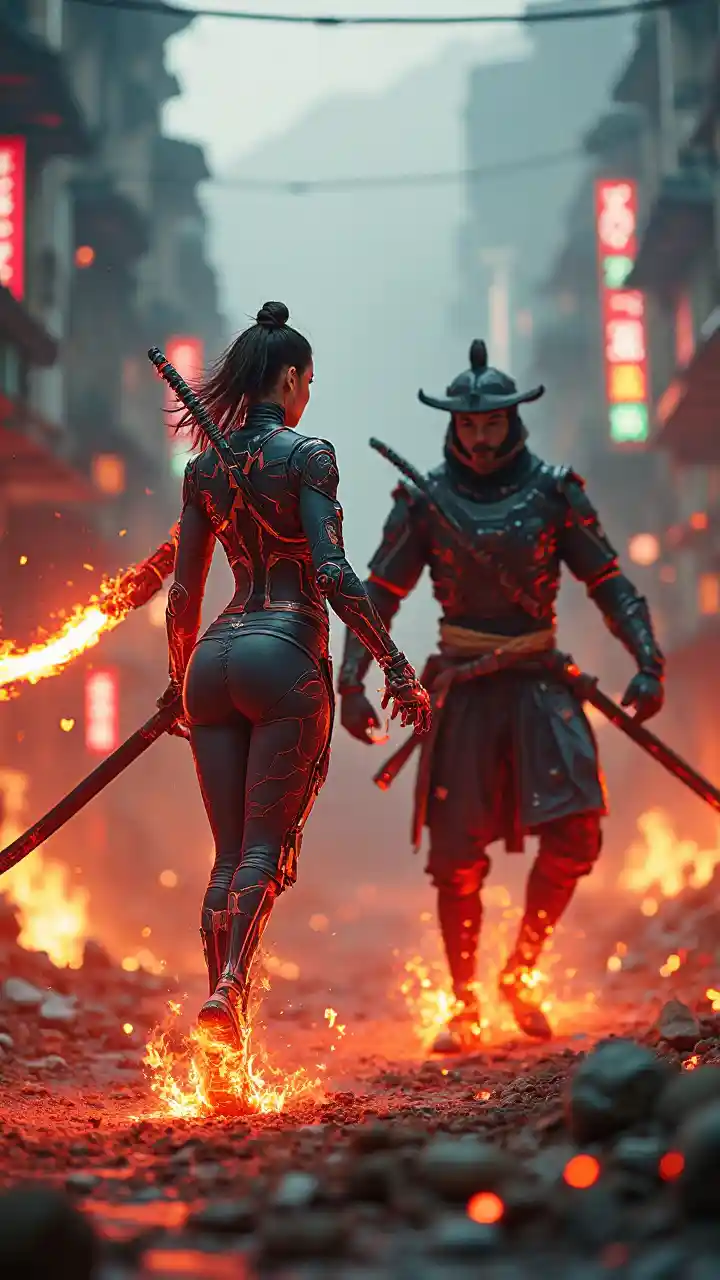 Kelly amp; Hayato Pha trộn Cảnh Gợi ý: Chiến trường rực lửa nơi Kelly và Hayato chiến đấu bên nhau. Mặc trang phục chạy nước rút ninja tương lai, Kelly lao về phía trước với tốc độ cực nhanh, để lại một tia năng lượng màu đỏ phía sau. Hayato, mặc một bộ giáp samurai với một dấu hiệu màu đỏ phát sáng, vẽ thanh katana của mình với một ngọn lửa nổ lách tách dọc theo các cạnh của nó. Cả hai nhân vật đều đứng trước một làn sóng kẻ thù và sức mạnh tổng hợp của họ tạo ra một sự pha trộn hoàn hảo giữa tốc độ và kiếm thuật. Bối cảnh là một thành phố trực tuyến bị phá hủy của Nhật Bản với các dấu hiệu neon và các mảnh vỡ đang cháy. Hình ảnh cực kỳ chân thực, điện ảnh, cực kỳ chi tiết 32K với độ mờ chuyển động năng động và ánh sáng kịch tính.