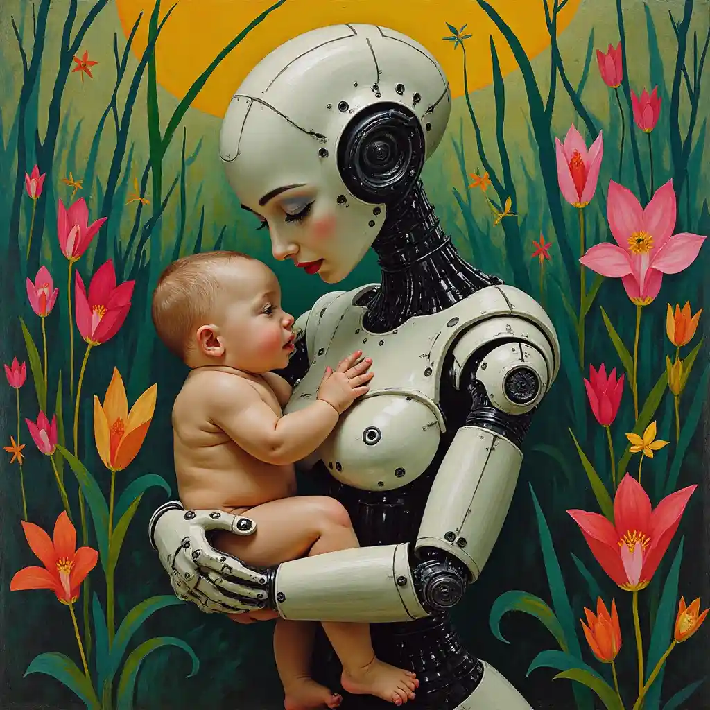 Ernst Ludwig Kirchner, vẽ tranh, một người phụ nữ robot đang bế một em bé người nhỏ. Họ đang ôm nhau. Bối cảnh là một thế giới rừng rậm ngoài hành tinh với những bông hoa ngoài hành tinh khác thường.