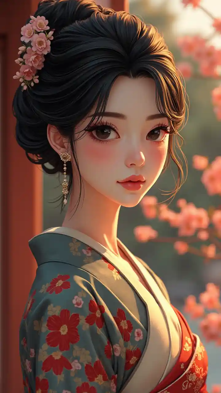 Tạo ra những cảnh sống động, tạo ra sự căng thẳng thị giác mạnh mẽ với chân dung của một người phụ nữ anime manga đồ họa Hàn Quốc tuyệt đẹp (mắt đen to và tóc đen, mặc kimono đẹp. Các đường đan xen và góc cạnh sắc nét tạo ra sự căng thẳng thị giác mạnh mẽ, trong khi bảng màu phong phú, ấm áp làm tăng cảm xúc tổng thể Cô đeo trang sức tối giản truyền thống bổ sung cho trang phục của mình.. Làn da của cô tỏa sáng nhẹ nhàng dưới ánh sáng tự nhiên và trang điểm tối giản nhưng thanh lịch, làm nổi bật đôi mắt và đôi môi của cô. Khung cảnh nên được chiếu sáng bằng các cảnh ánh sáng và bóng tối kịch tính để làm nổi bật đường nét của cảnh. Background là một thiết lập cung điện ngoài trời mơ hồ cung cấp một sự tương phản mềm mại cho hàng đầu của cô và kết cấu chi tiết của đồ trang sức. Hình ảnh phải gợi lại cái nóng oi bức của mùa hè, nắm bắt cường độ của cái nóng và vẻ đẹp tự nhiên của sự nở rộ.