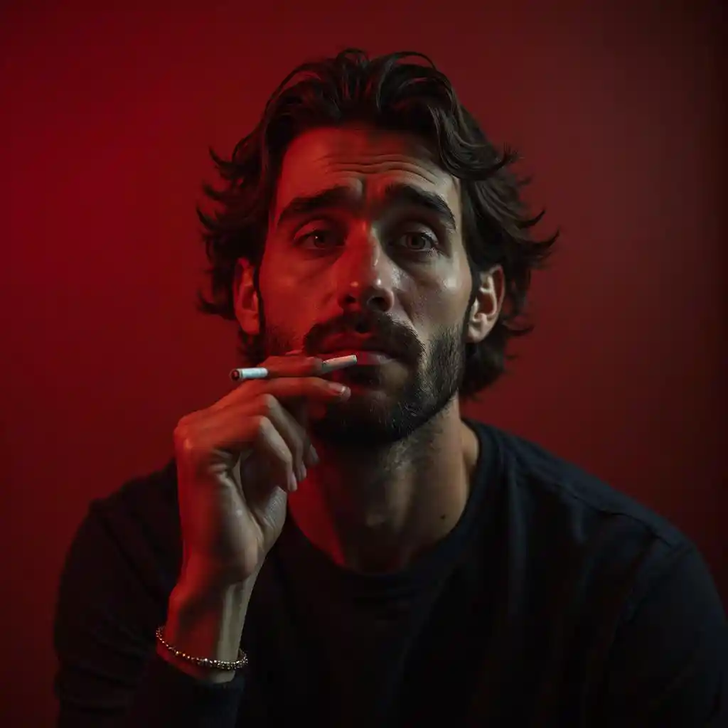 Người đàn ông hút thuốc lá trong căn phòng màu đỏ