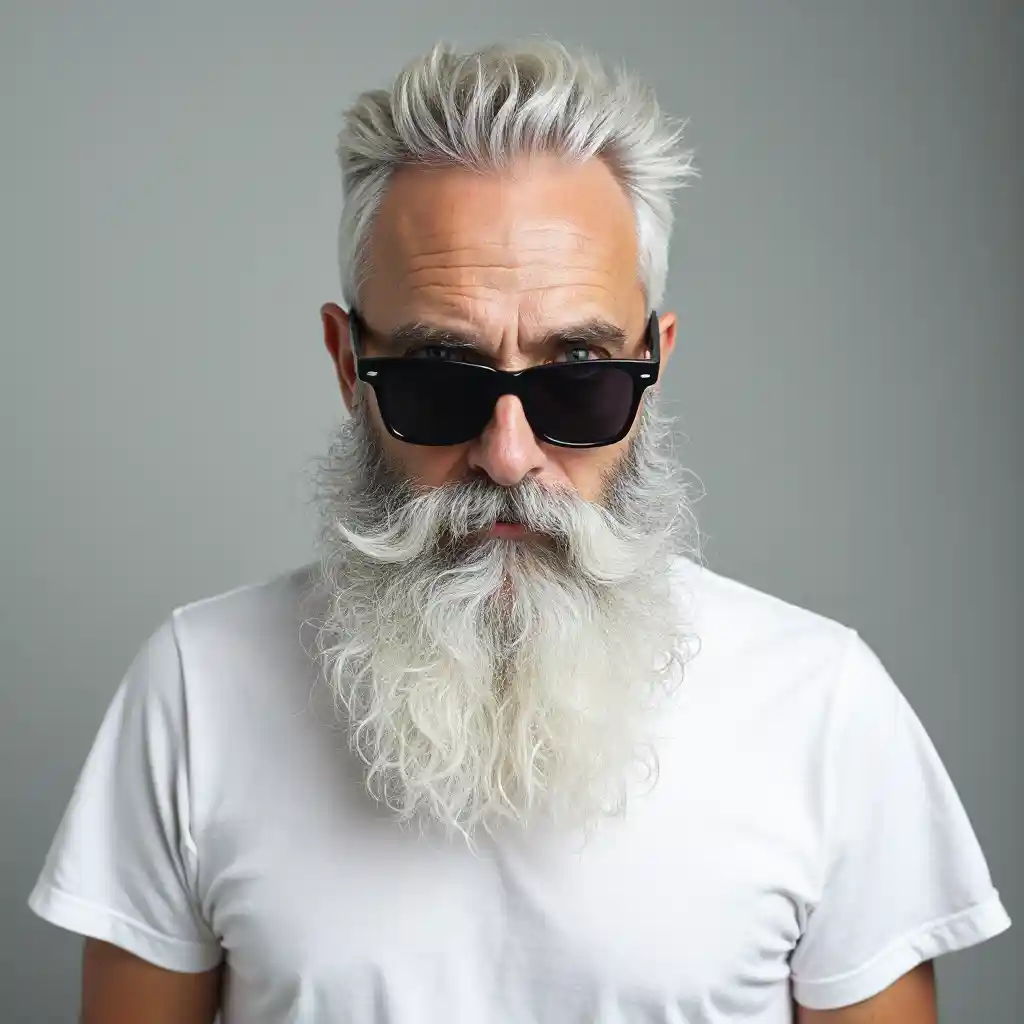 Thân của một (người đàn ông có bộ râu dài), mặc ((kính đen)), áo phông trắng, (((tóc trắng)), nhìn chính diện, nền xám