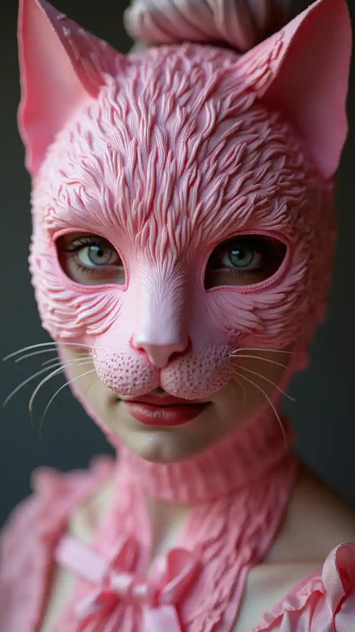 GrimChụp ảnh chân dung cận cảnh, một phụ nữ lộng lẫy đeo mặt nạ phụ nữ mèo màu hồng, góc nhìn 80 độ, tác phẩm nghệ thuật của Sergio Lopez, Natalie Shaw, James Jean và Salvador Dali