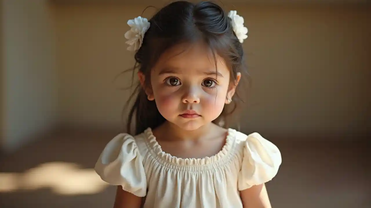 (((Cô bé 5 tuổi dễ thương, buồn bã))) từ Mexico mặc ((((Áo cưới Mexico điển hình, màu trắng))), (thực tế: 1.4, thực tế), chi tiết cao CG thống nhất 8K nền, 1 đứa trẻ, nhìn vào khán giả, (HQ skin: 1.4), 8k Ultra HD, DSLR, ánh sáng mềm mại, chất lượng cao, hạt phim, Fuji XT3, ((đơn giản, nền trung tính)).