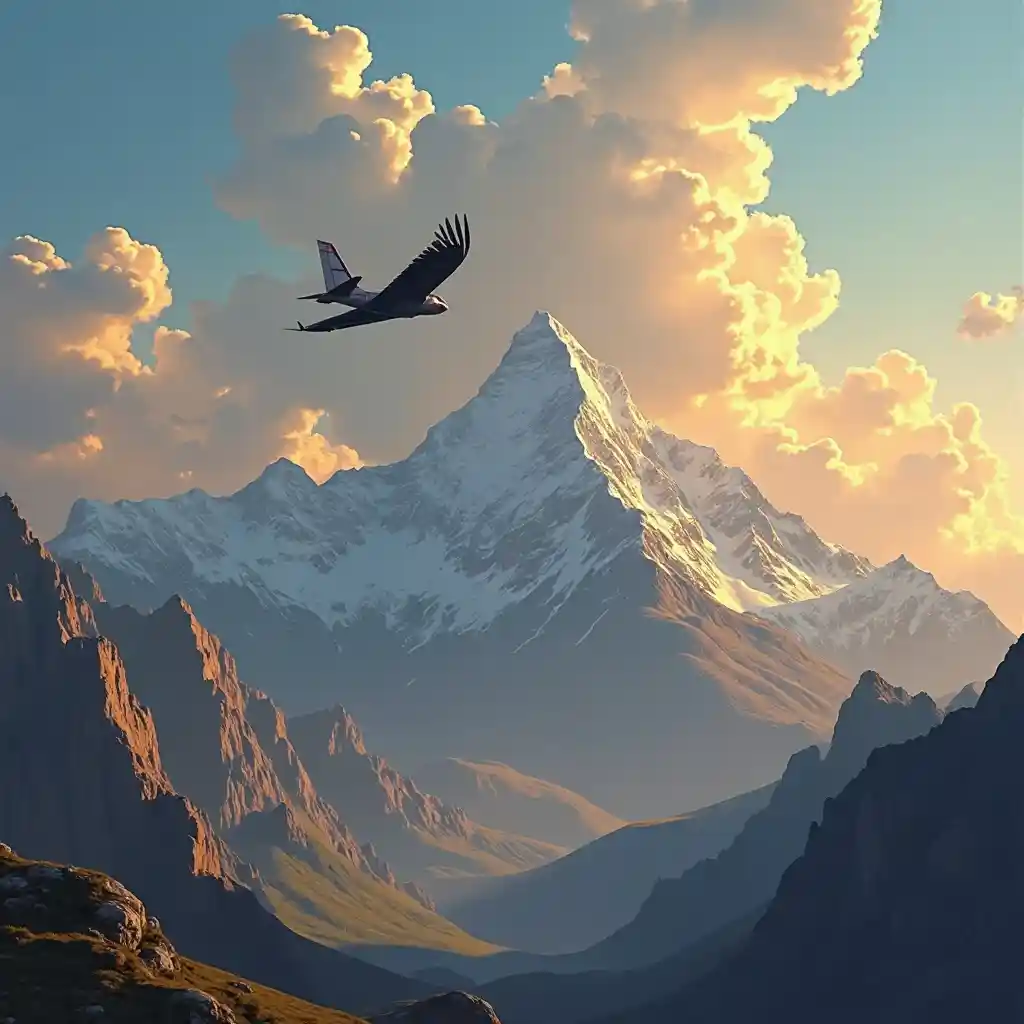 (Chim bay trên núi), (Máy bay bay trên cao), phong cách Alson S. Clark, vẽ cảnh Mỹ, vẽ mờ chi tiết, bầu trời rộng lớn, mây ấn tượng, cảnh núi yên tĩnh, tông màu đất ấm áp, độ chi tiết cao, (siêu chi tiết), kết cấu thực tế, bầu không khí quyến rũ, quan điểm trên cao, bầu không khí yên tĩnh và tuyệt vời.
