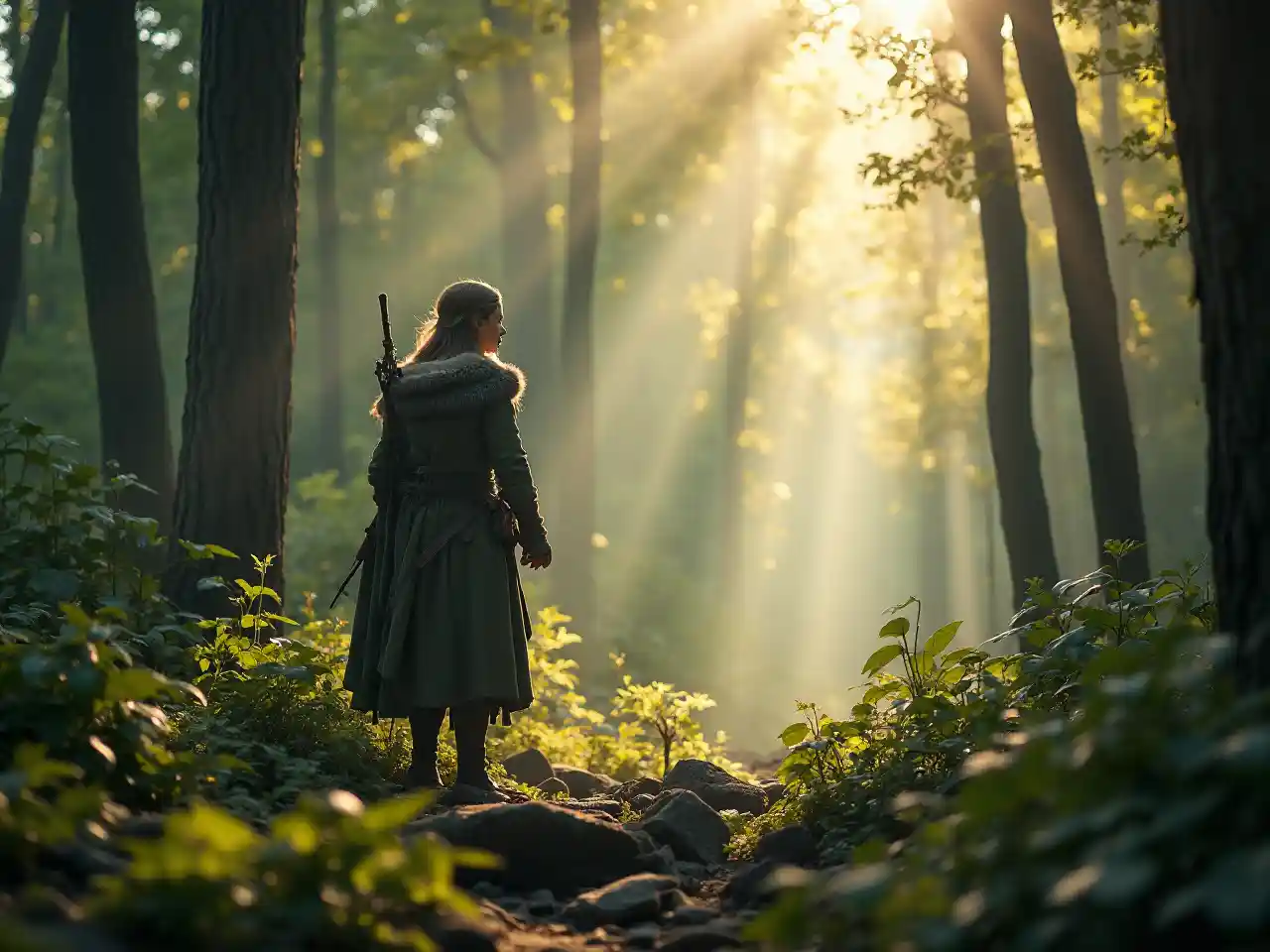 Elf Ranger trong khu rừng bí ẩn xung quanh ánh sáng mặt trời. Mọi thứ đều ổn