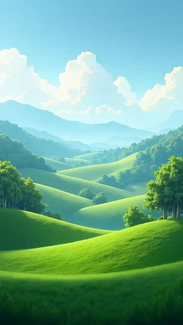 Nền cảnh quan yên tĩnh, những ngọn núi xanh tươi tốt, những đám mây mềm mại, bầu trời trong xanh, bầu không khí yên tĩnh, màu sắc sống động, vẻ đẹp tự nhiên, cảnh quan yên tĩnh, ánh sáng mặt trời tinh tế được lọc qua cây, phong cảnh đẹp như tranh vẽ, thiên nhiên hài hòa, siêu chi tiết, độ nét cao, chất lượng phim, bầu không khí nhẹ nhàng.