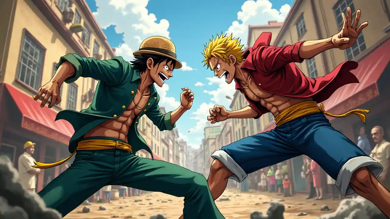 One Piece Sanji Fighting Zoro, cảnh hành động năng động, phong cách anime, màu sắc tươi sáng, năng lượng kịch tính, bóng tối tương phản cao, gió lượn xung quanh, biểu cảm dữ dội, 4K chất lượng cao, siêu chi tiết, thể hiện kỹ năng chiến đấu độc đáo của họ, được bao quanh bởi bối cảnh hỗn loạn của khu vực công cộng nhộn nhịp, nắm bắt cảm giác hồi hộp của cuộc đối đầu của họ.