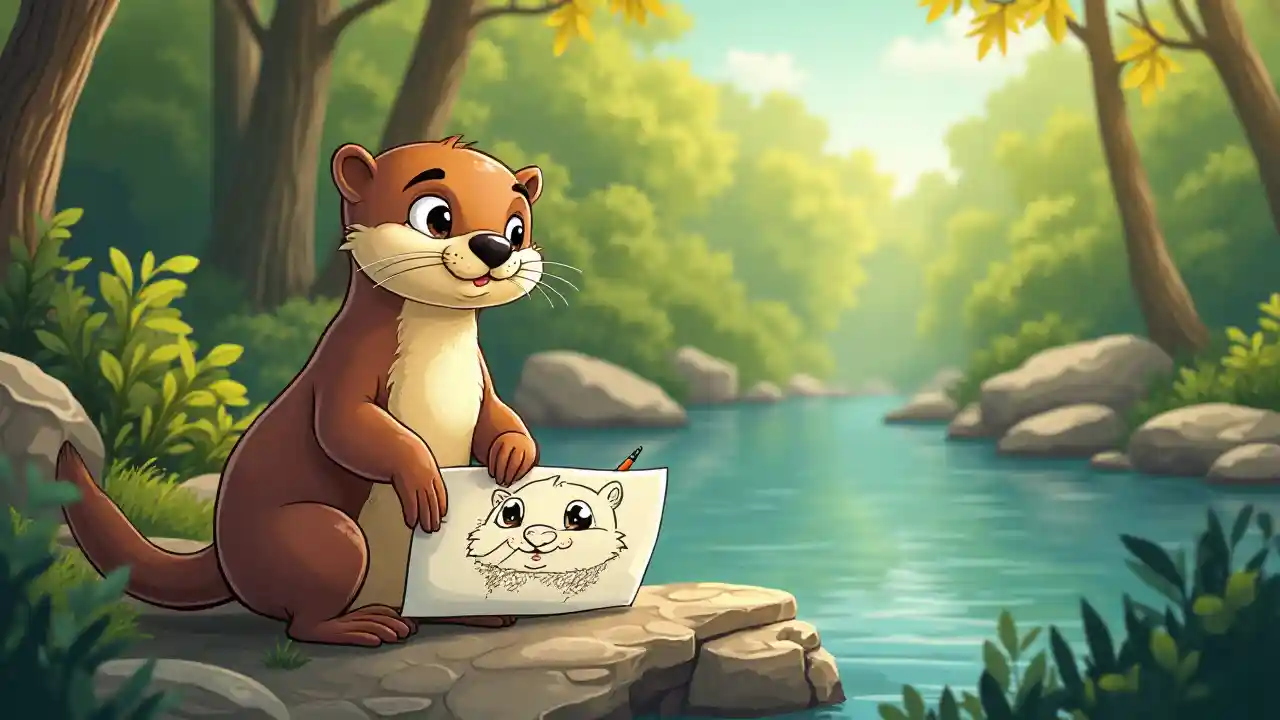 Một con rái cá trong phim hoạt hình đang ngồi bên bờ sông trong rừng, trên tay cầm một cây bút chì và một bảng vẽ với một bản phác thảo mặt rái cá.