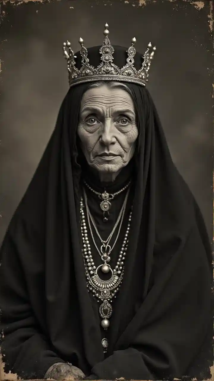 Ảnh vintage Daguerreotype, đen trắng, siêu chi tiết cụ bà 100 tuổi với hibab Ả Rập, áo choàng đen và vương miện vàng trong vương quốc Ottoman, trang sức quốc gia, độ sâu trường ảnh narow, khuôn mặt nhăn nheo chi tiết, môi trường ngày tận thế, tư thế cơ thể tự nhiên, chụp bằng máy ảnh khổ lớn cổ, 64k, siêu chi tiết, siêu chính xác chi tiết, cạo