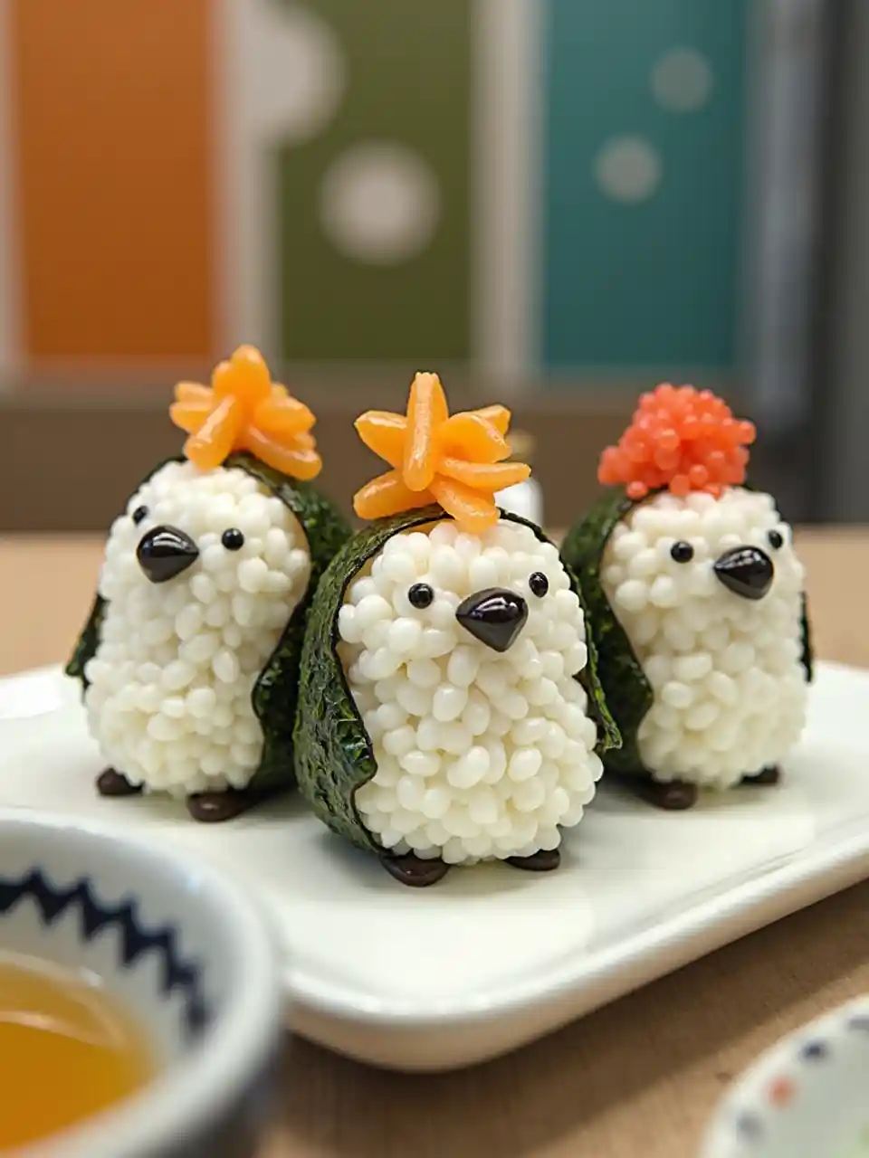 Đây là hình ảnh của một món sushi Nhật Bản được làm theo hình chim cánh cụt. Bên trong là một nhà hàng Nhật Bản đầy màu sắc và sống động. Sushi được sắp xếp trên một chiếc đĩa hình chữ nhật màu trắng với nền sạch sẽ và tối giản. Ba con chim cánh cụt được miêu tả, mỗi con có một đỉnh duy nhất. Những con chim cánh cụt này được tạo thành từ sự kết hợp của gạo trắng và rong biển màu xanh đậm, giống như cơ thể của chim cánh cụt. Đầu của mỗi con chim cánh cụt bao gồm gạo trắng, mắt có một chấm nhỏ đơn giản và mỏ có một đường. Trên đỉnh đầu được trang trí bằng một miếng rong biển màu cam, được tạo hình thành một cái nhìn xoăn, giống như lông vũ, giống như một cái đỉnh. Mỗi con chim cánh cụt được bao bọc bởi một miếng rong biển màu xanh đậm, bắt chước lông của chim cánh cụt. Trên đầu chim cánh cụt là nhiều loại topping khác nhau, mỗi loại bổ sung một yếu tố khác nhau cho nhân vật: một là một lát gừng ngâm đỏ, một là một lát trứng cá hồi cam, và thứ ba là một lát gừng ngâm đỏ. Tổng thể trình bày sạch sẽ và nghệ thuật, và cách sắp xếp sushi nhấn mạnh sự dễ thương và vui tươi của món ăn.