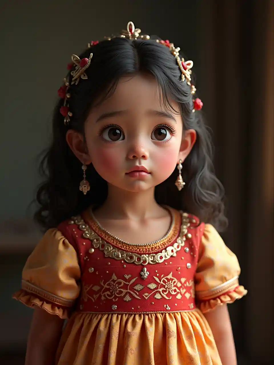 ((Cô bé 5 tuổi đáng yêu, buồn bã))) Perú mặc (((((Váy cưới điển hình của Perú, với các họa tiết hình học màu vàng và đỏ))), (tả thực: 1.4, sống động như thật), CG chi tiết cao thống nhất nền 8K, 1 đứa trẻ, nhìn vào khán giả, (HQ skin: 1.4), 8k Ultra HD, DSLR, ánh sáng mềm mại, chất lượng cao, mô hình phim, Fujifilm XT3, (((nền trung tính đơn giản)).
