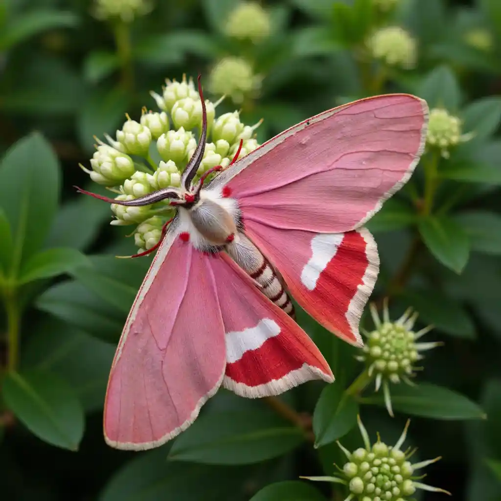 BettyMột con sâu bướm hồng rực rỡ với sọc đỏ đậu trên một cây có hoa màu trắng và nụ màu xanh lá cây.