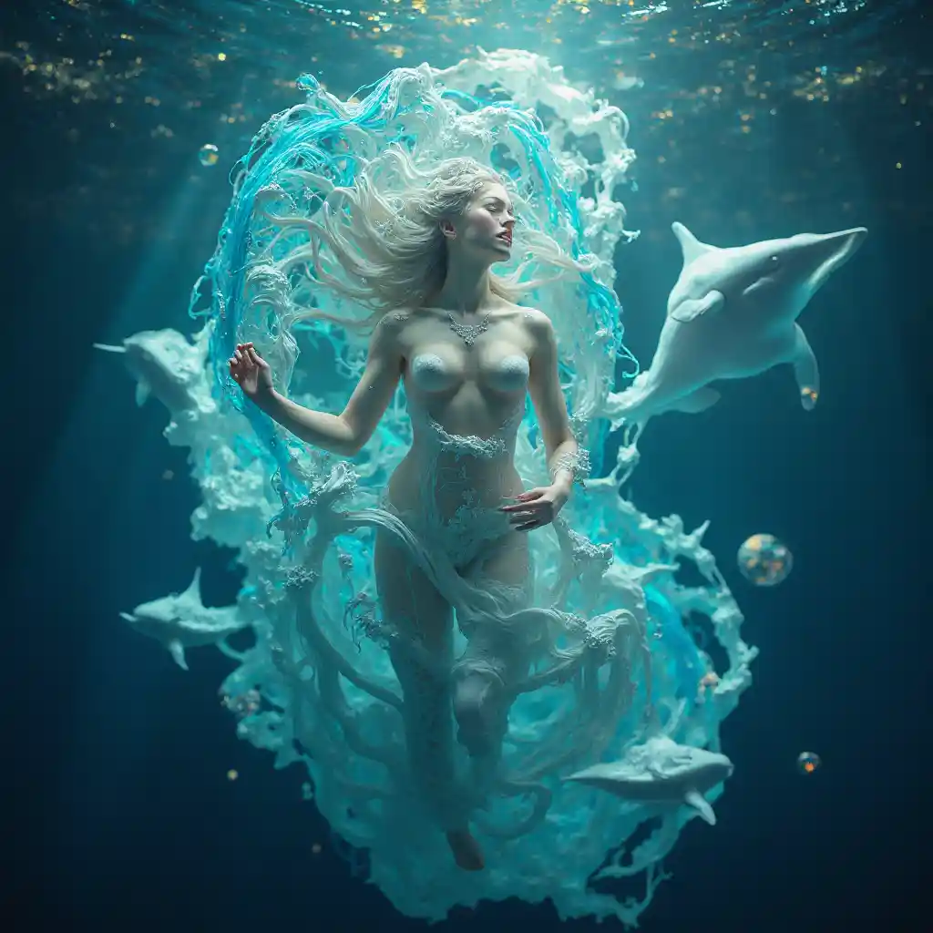 Sao Kim mọc lên từ biển lượng tử # sao kim # đại dương # động vật # dung hợp # kinh điển # đại dương # sinh ra # AI # thiên nhiên # tương lai Trong một đại dương công nghệ sinh học phát sáng, ngôi sao vàng không xuất hiện từ vỏ sò, mà từ vòng xoáy của mã sinh học và bụi sao, được bao quanh bởi những con cá heo được tạo thành từ ánh sáng tinh khiết và các tia dơi được thiết kế fractal lấp lánh.