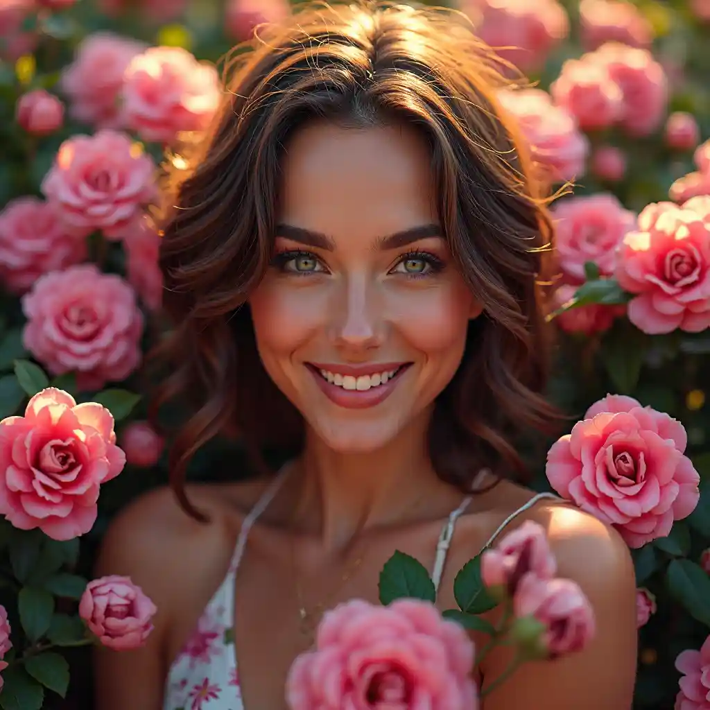 Trong tấm thảm đầy hoa rực rỡ, một người phụ nữ duyên dáng nở một nụ cười rạng rỡ, được chụp dưới ánh đèn điện ảnh, một phong cách chân thực gợi nhớ đến tính nghệ thuật của Carol Buck, với đôi mắt lấp lánh cuộc sống, được bao quanh bởi những cánh hoa lấp lánh với các chi tiết phức tạp.