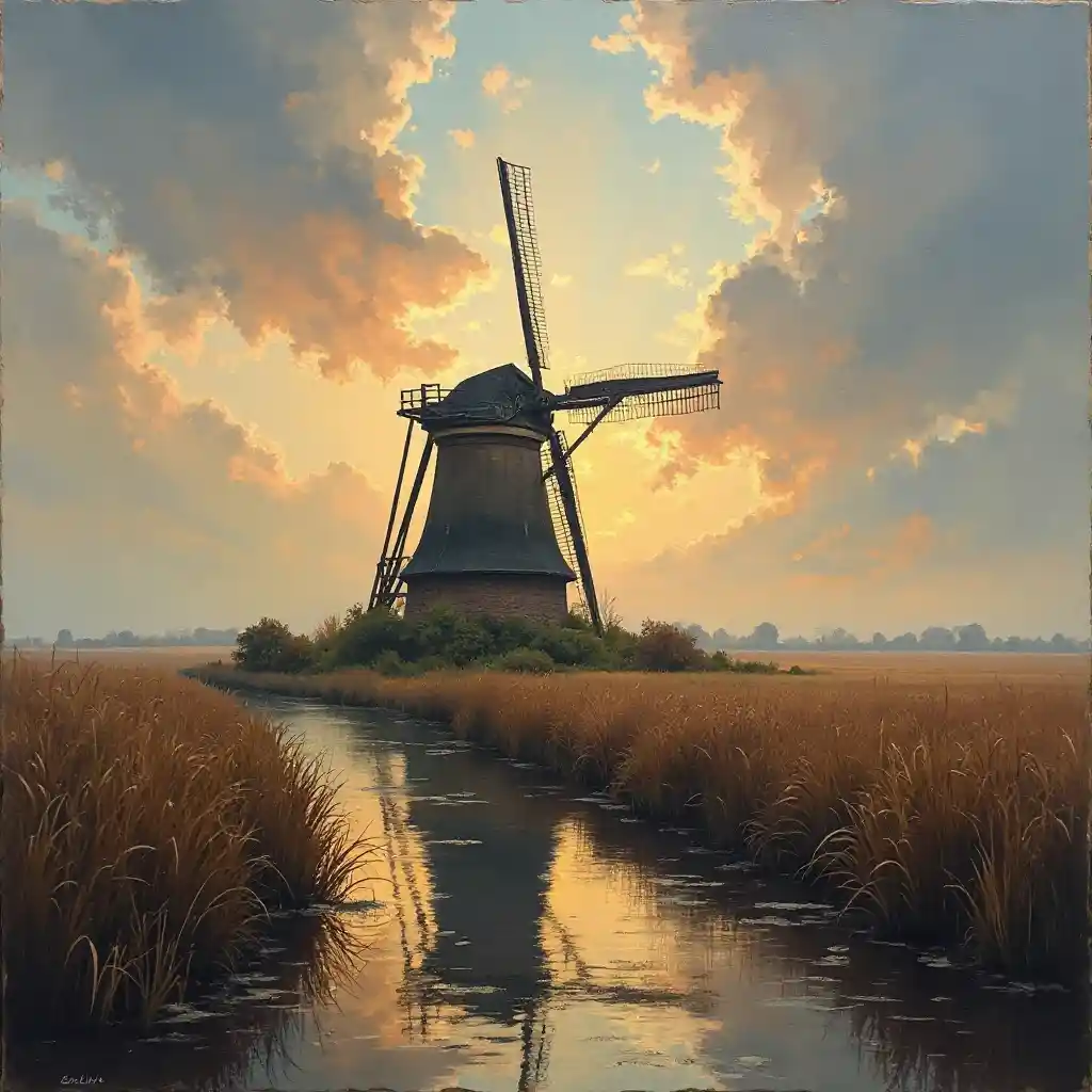 ZoeTranh sơn dầu thời Phục hưng, cối xay gió Hà Lan với ánh sáng ấn tượng vào buổi trưa trên một số bờ đất ngập nước ở vùng nông thôn, nét vẽ hơi kết cấu, bóng râm mềm mại