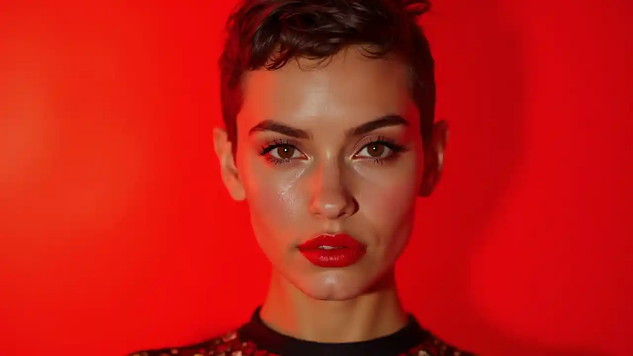 Chân dung Sami Gayle, màu sắc tươi sáng, ánh sáng tương phản, độ chi tiết cao, nền đỏ, son môi đỏ,