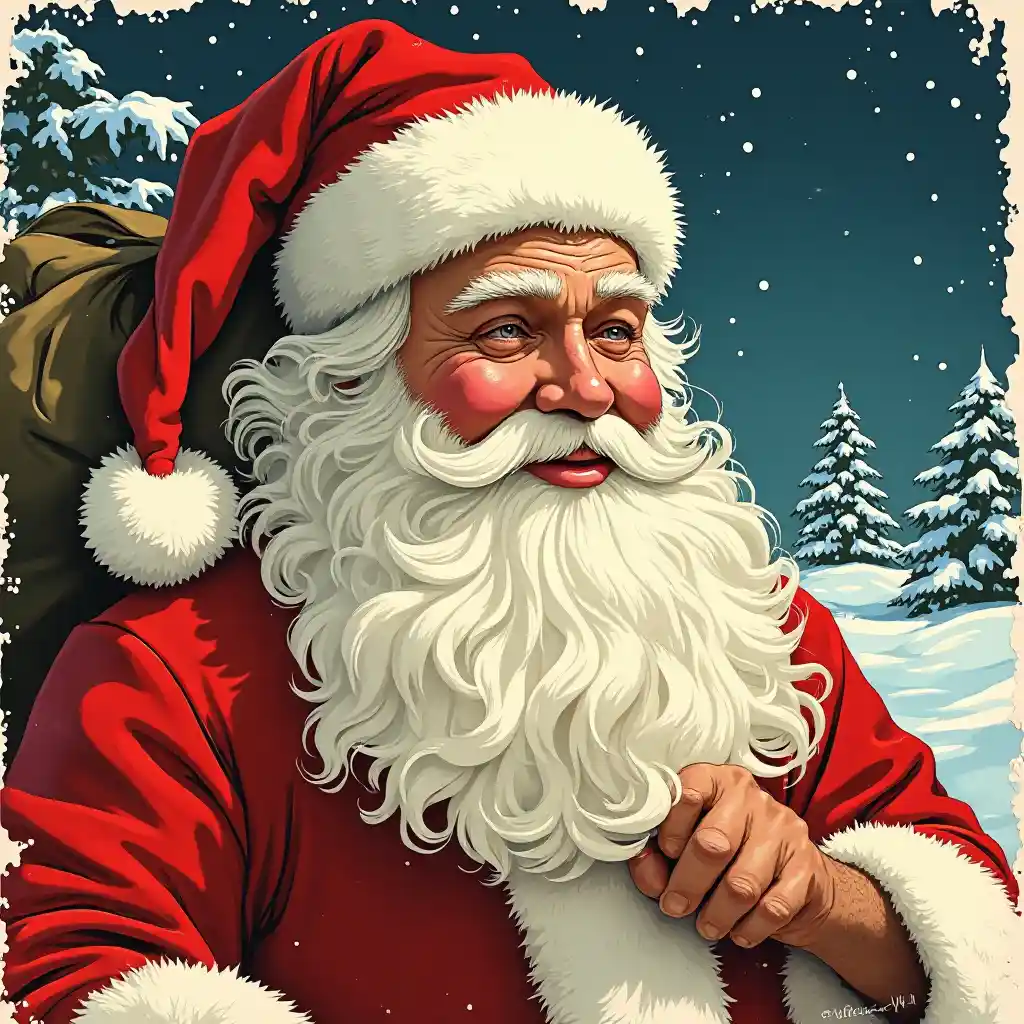 Tác phẩm nghệ thuật này của George Wilson về ông già Noel là một bức tranh và minh họa phong cách áp phích nổi bật đại diện cho phong cách bột giấy mang tính biểu tượng.