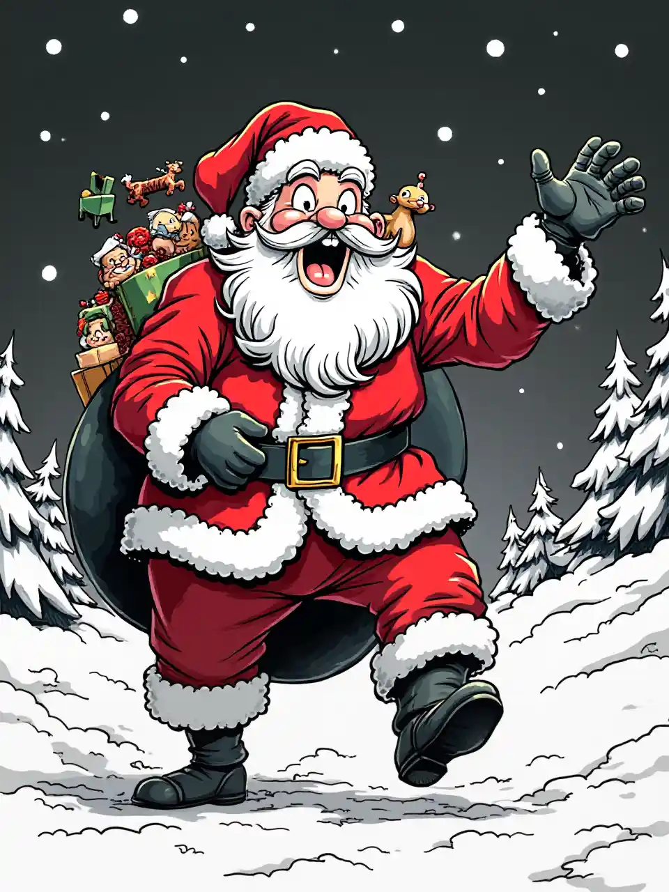 (đen trắng), ông già Noel giao đồ chơi, (biểu cảm phóng đại), giai điệu hài hước, (phim hoạt hình phong cách Robert Krum), hình bóng rõ ràng, vui tươi năng động, chi tiết kỳ quái, bảng màu giới hạn với bộ đồ ông già Noel màu đỏ đậm, bầu không khí kỳ quặc, sử dụng chiến thuật của ánh sáng và bóng tối, hình minh họa siêu chi tiết 4K.
