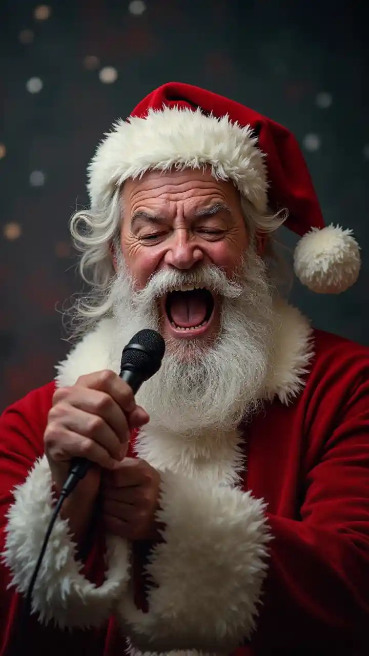 RobinHình ảnh ông nội râu xám cầm micro há miệng la hét hát karaoke mặc đồ ông già Noel Giáng sinh