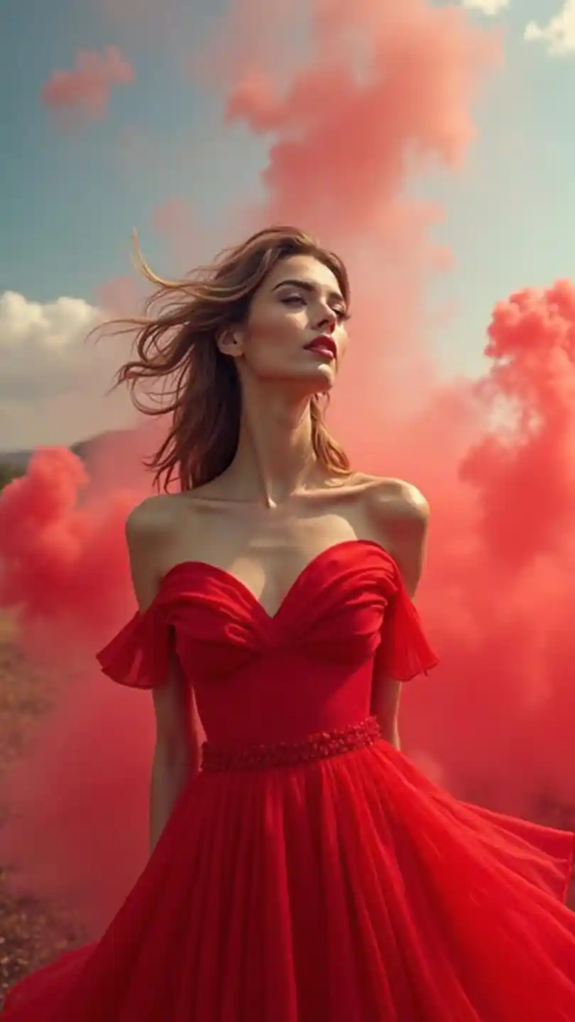 Người phụ nữ mặc váy đỏ trong làn khói đỏ