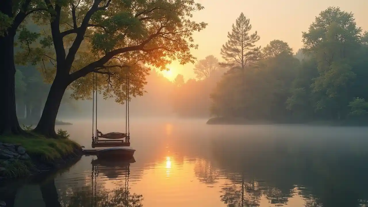 Hãy tưởng tượng một ngôi nhà hồ yên tĩnh với mặt trời mọc và sương mù trên mặt nước, và một chiếc xích đu và một chiếc thuyền