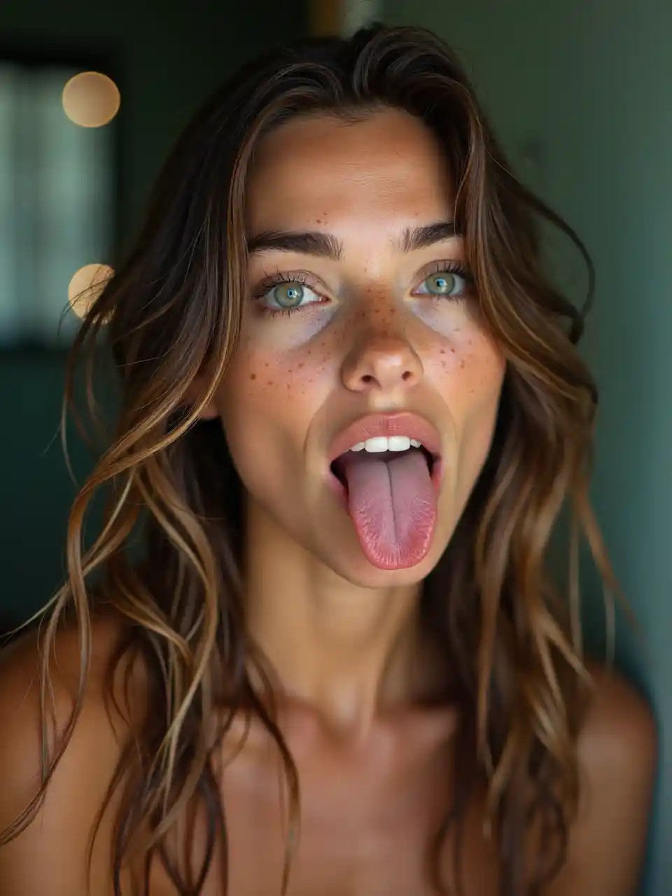 Instagram selfie, người phụ nữ 21 tuổi tuyệt đẹp, lè lưỡi, chi tiết da mặt và mắt, ánh sáng tự nhiên, ướt khi tắm, tóc dài, hạt màng, độ tương phản thấp, khuôn mặt tự nhiên, tàn nhang, tóc nâu sáng, mắt màu xanh lá cây