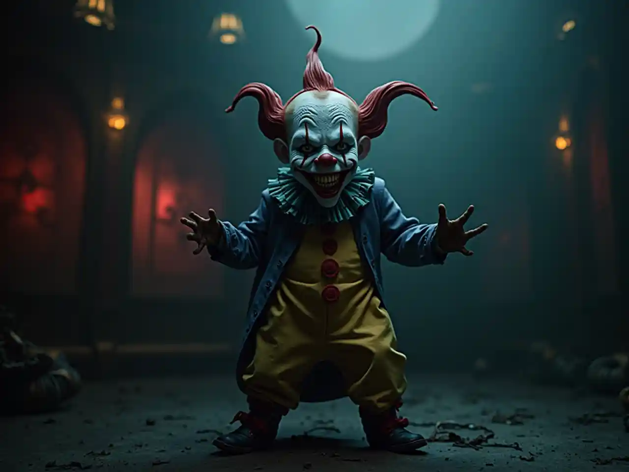 Một chú hề đe dọa, nhỏ bé và có nụ cười nham hiểm đang biểu diễn trong một buổi biểu diễn xiếc tối tăm và méo mó. Bầu không khí chìm trong nỗi kinh hoàng, với bóng tối, thiết kế phức tạp và các chi tiết kỳ lạ. Kịch tính, ánh sáng điện ảnh đổ bóng sâu và tăng cường bầu không khí đáng lo ngại. Cảnh tượng thực tế, ghi lại bản chất của những cảnh tượng rùng rợn với tiếng ồn của rạp chiếu phim, được hiển thị ở độ phân giải 8k tuyệt vời.