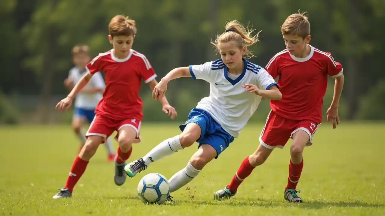 Trong một trận bóng sôi động diễn ra trên sân cỏ, một cầu thủ mặc đồng phục màu trắng có điểm nhấn màu xanh đã khéo léo điều khiển trái bóng để tránh hai đối thủ mặc áo đỏ. Khi cầu thủ đối phương thể hiện sự tập trung, cố gắng giành lại quyền sở hữu, mức độ dữ dội ngay lập tức là rõ ràng. Khung cảnh được tạo thành từ những hàng cây thưa thớt ở hậu cảnh, được chiếu sáng bởi ánh sáng tự nhiên gợi ý về trận đấu buổi chiều. Các cầu thủ thể hiện sự pha trộn giữa quyết tâm và thể thao, truyền tải bản chất của tinh thần bóng đá trẻ, trong khi địa hình sân cỏ thêm một nét mộc mạc cho nền.