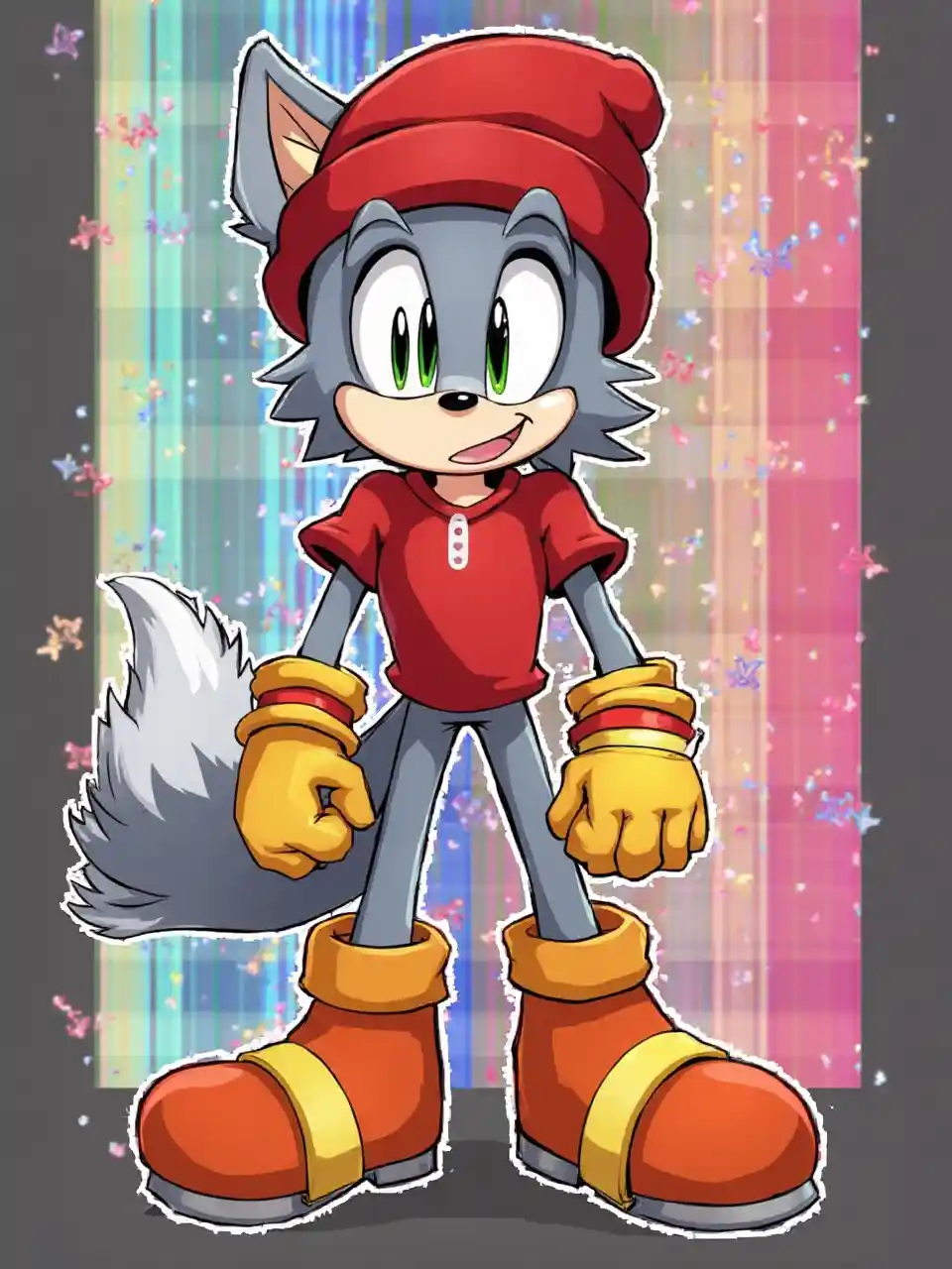 Sonic phong cách nhân vật phim hoạt hình sói xám mặc đậu đỏ, áo sơ mi màu đỏ, ủng màu cam, găng tay màu vàng trên nền đầy màu sắc.