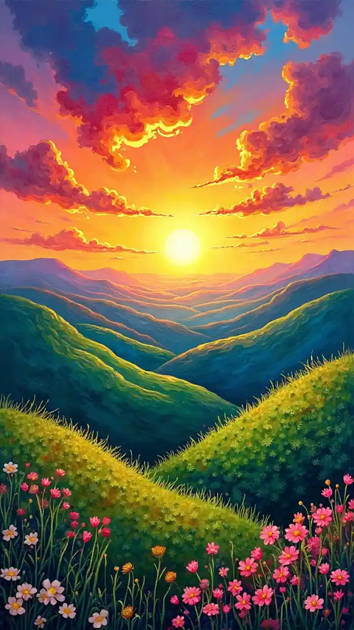 Tranh phong cảnh sống động, được tạo ra bằng cách sử dụng các kỹ năng vẽ ngón tay, màu sắc phong phú kết hợp liền mạch, thể hiện kết cấu và chi tiết, một buổi hoàng hôn ngoạn mục chiếu bóng vàng ấm áp lên bầu trời, những ngọn núi xanh tươi lăn về phía xa, màu sắc rực rỡ nhảy múa cùng nhau, bố cục nhập vai hấp dẫn, bầu không khí kỳ lạ, độ sâu cao, siêu chi tiết, giọt nước lấp lánh từ sơn ướt, biểu cảm nghệ thuật phi thường.