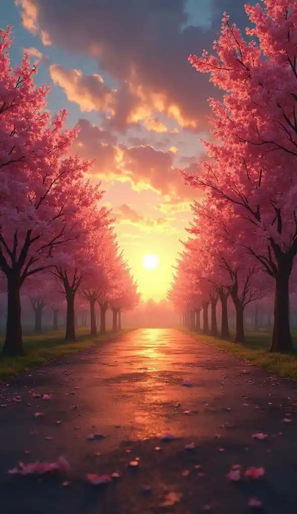 BettyCảnh kịch tính, chất lượng siêu, một mình, cận cảnh: 1. Khuôn viên rộng lớn yên tĩnh và thanh bình 21:1.331, những cây anh đào xếp hàng dài ở phía xa, ánh hoàng hôn chiếu vào, ống kính