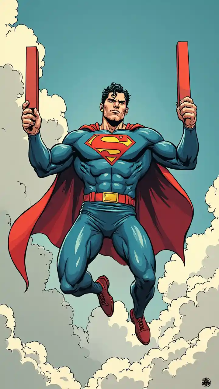 Một chiếc áo thun Superman, một người đàn ông bay trên không trung với hai tay giơ cao chữ I, trên đó có biểu tượng Superman, Carles del Krauss là, superflat, anh hùng, bảng viết truyện tranh