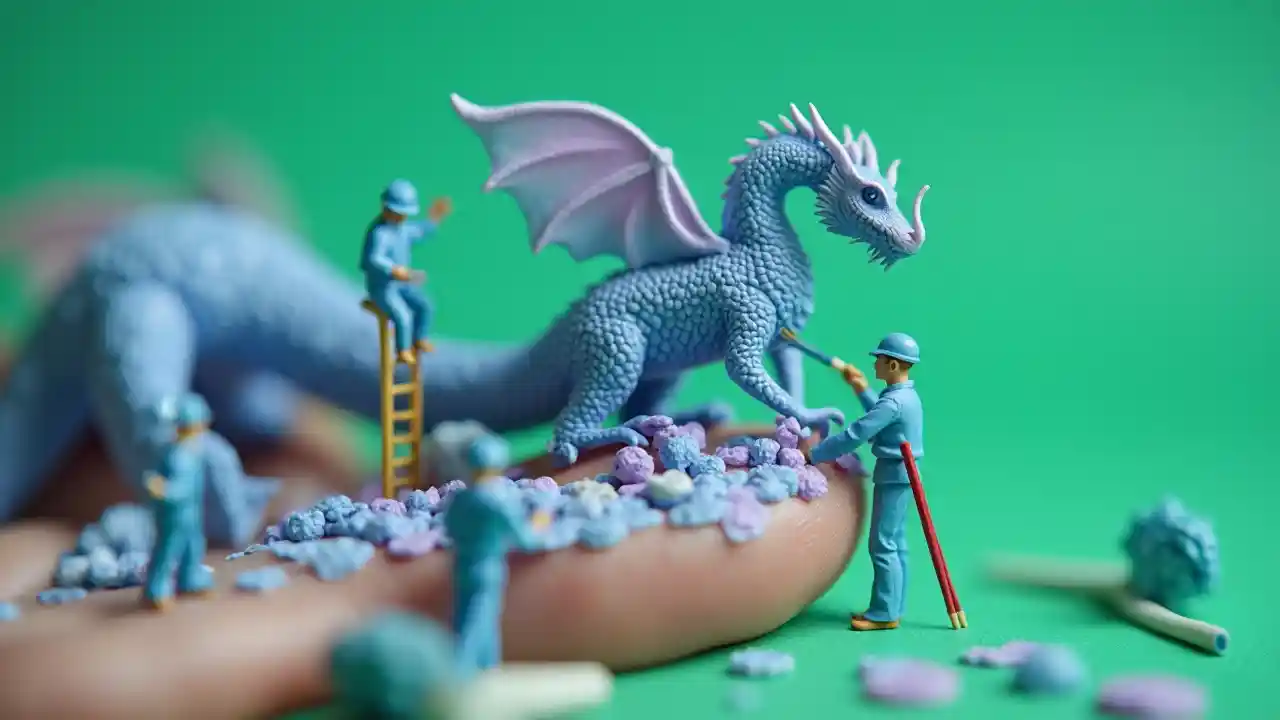 Trong một cảnh nghệ thuật siêu thực kỳ quái, các công nhân thu nhỏ trong bộ đồng phục màu xanh sống động đang vẽ cẩn thận trên móng tay quá khổ của họ, vẽ một con rồng hoa oải hương màu ombre quyến rũ, vẫy những cây cọ khổng lồ chính xác và tài năng. Những người khác đang bận rộn đánh bóng bề mặt bóng của họ bằng vải mỏng, và sự cống hiến của họ tỏa sáng khi họ đứng trên những chiếc thang nhỏ và bục trên cao. Nền ngọc lục bảo táo bạo, sống động tạo ra sự hài hòa thị giác nổi bật và nâng cao chất lượng tuyệt vời của cảnh. Hình ảnh thực tế này ghi lại kết cấu phức tạp và cung cấp độ sâu trường ảnh giống như phim, kết hợp bầu không khí vui tươi nhưng chuyên nghiệp với sự sáng tạo giàu trí tưởng tượng.