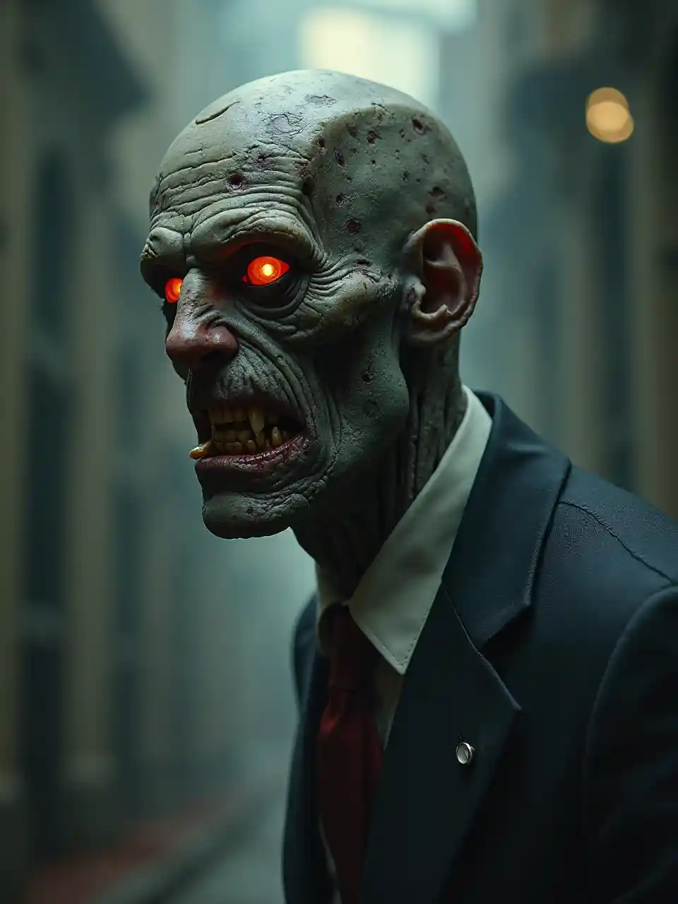 Zombie, được miêu tả là CEO tàn nhẫn của 500 công ty hàng đầu thế giới, siêu thực, ống kính Sony FE 70-200mm f/2.8 Universal OSS, 4K