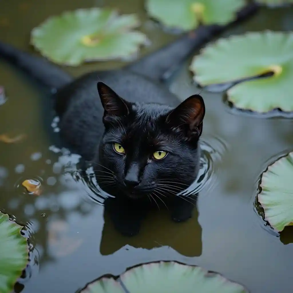 MaverickMột con mèo đen chìm trong nước bình tĩnh bơi đi, trong nước có hoa súng