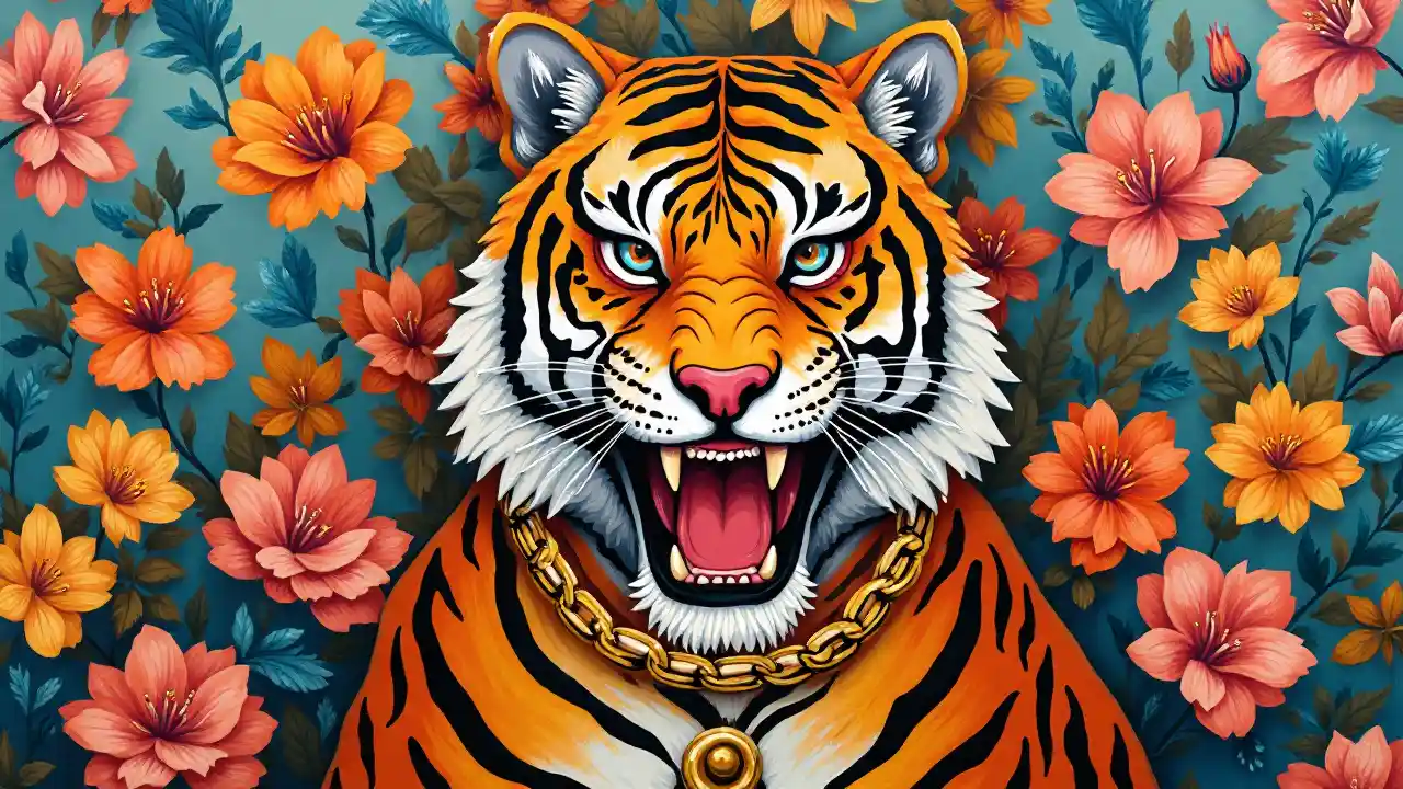 Một con hổ man rợ với một chuỗi vàng trên cổ, nền hoa, màu đồng bằng, phong cách Catherine Nolling, bức tranh, acrylic, dầu, chân dung, nội thất, Mỹ
