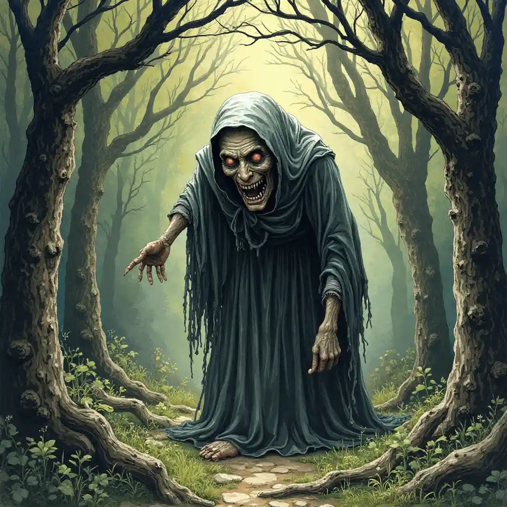 Một bà già xấu xí và đáng sợ trong rừng, vẽ theo phong cách cổ tích và minh họa đại diện cho phong cách Anh.