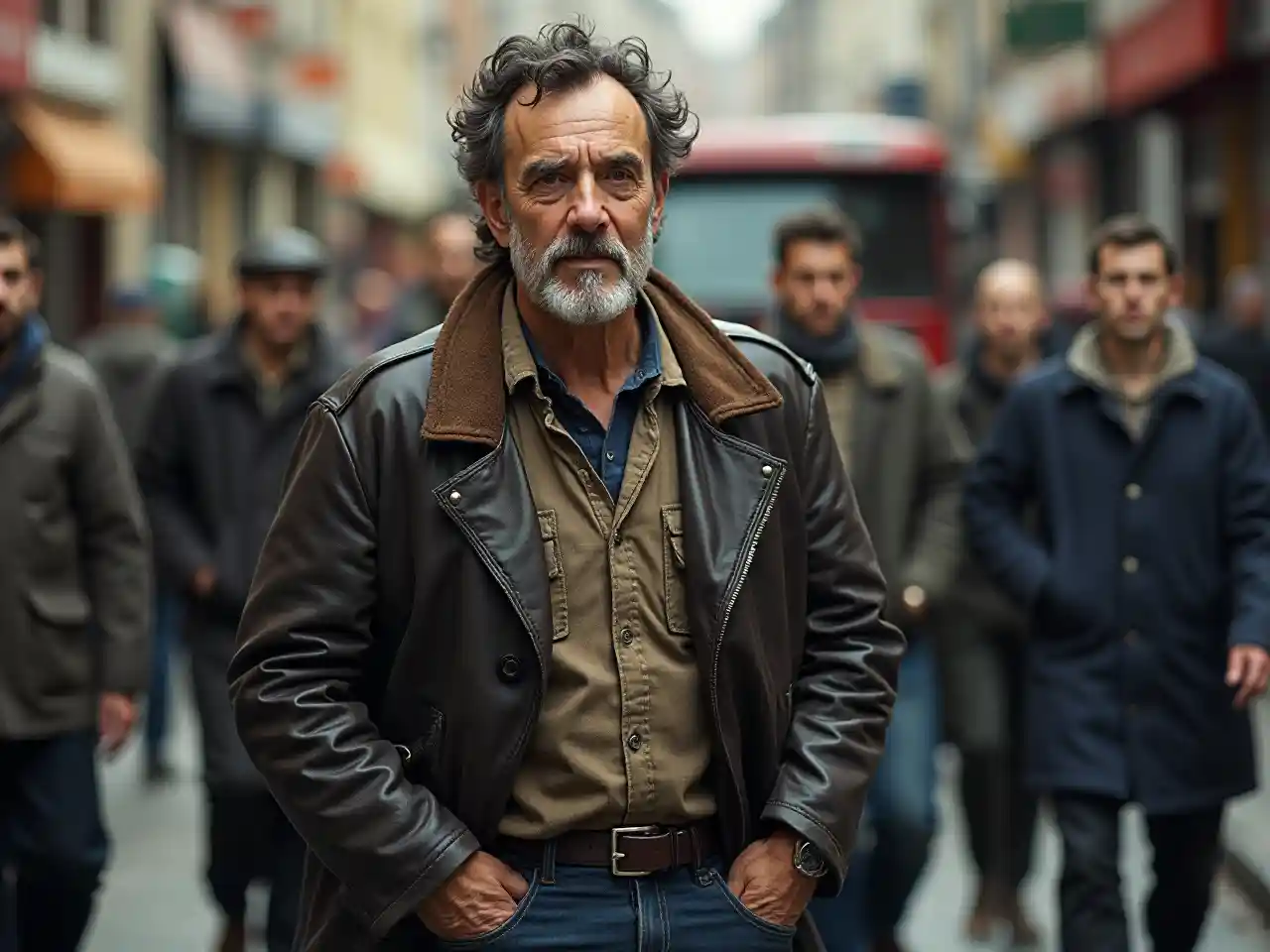 (Người lái xe tải trung niên trong bộ đồ da), đi bộ trên đường phố, (chi tiết thực tế), quần áo chi tiết có kết cấu, ánh sáng tự nhiên đổ bóng nhẹ nhàng, (cảnh thành phố), người ngoài cuộc ở hậu cảnh, ghi lại một khoảnh khắc thẳng thắn, một bầu không khí hơi cứng rắn, (4K siêu chi tiết), gợi lên những điều kỳ lạ của cuộc sống hàng ngày.