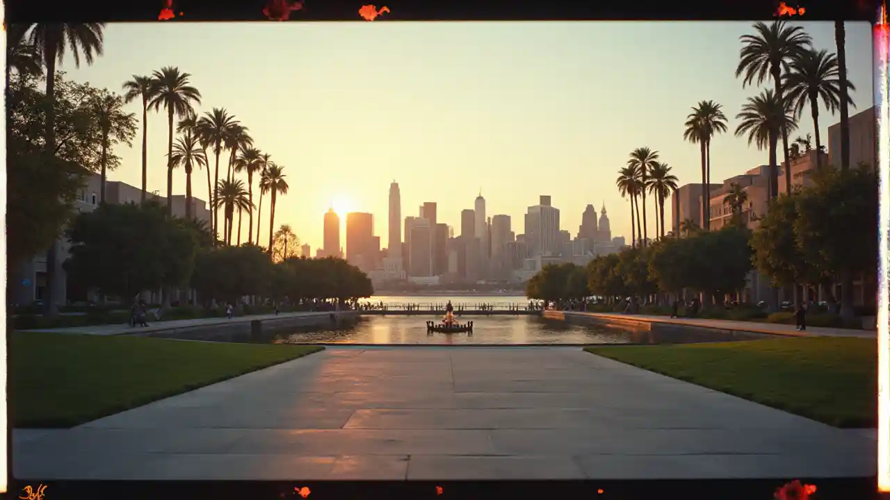 ảnh polaroid của đường chân trời thành phố, góc cứng, sân, đại lộ ven biển, hoàng hôn buổi tối, ánh sáng hoàng hôn Los Angeles, ảnh thực tế, phim, rạp chiếu phim