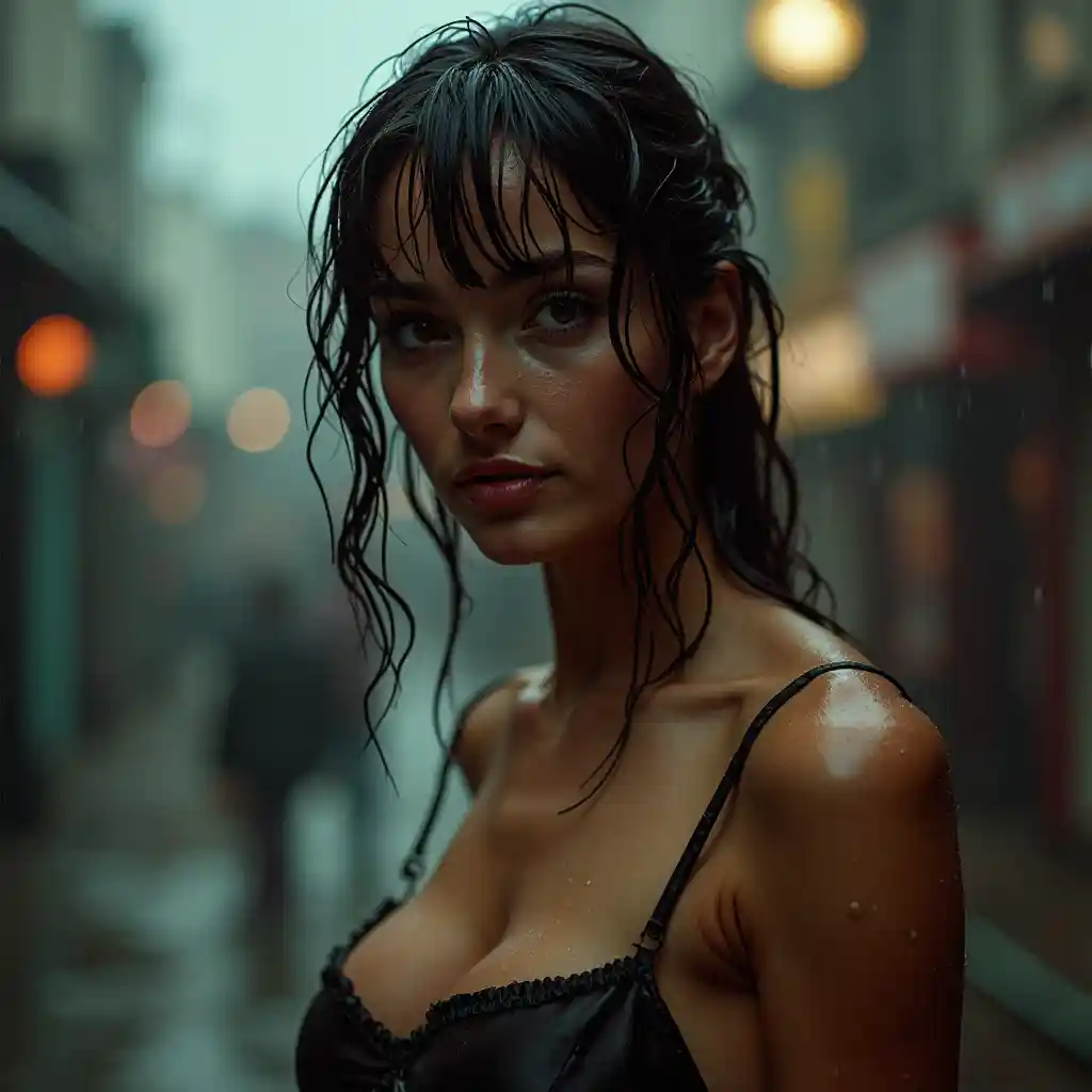 2000s retro RAW ảnh, thực tế, hạt phim, chụp lén, phim phân loại màu, bắt mắt theo dõi ánh sáng, bầu không khí ánh sáng, chụp macro, da lỗ chân lông, nhược điểm, tự nhiên, tóc ướt ngực lớn đứng trong mưa sexy chân dung phụ nữ, thực tế, độ chi tiết cao, ảnh định dạng trung bình, độ phân giải 8k